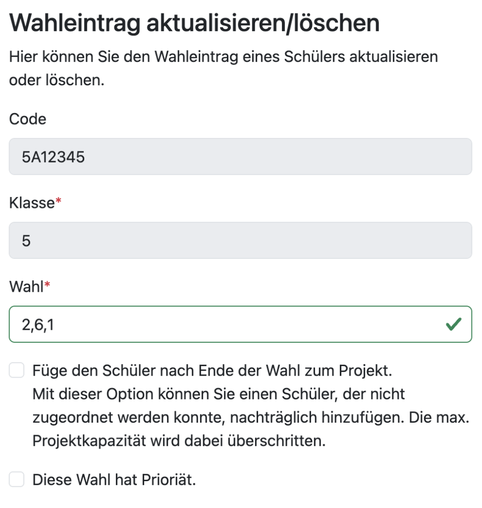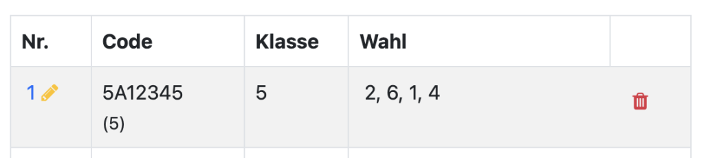 - Wahl – Im Beispiel wurden die Projekte 2,6,1 gewählt. Wenn Sie die Wahl nun z.B. mit dem Wert 2 überschreiben, wird der Schüler zum Projekt 2 zugeordnet. (Oder gar nicht, falls das Projekt überbucht ist)