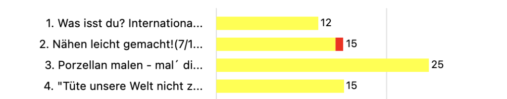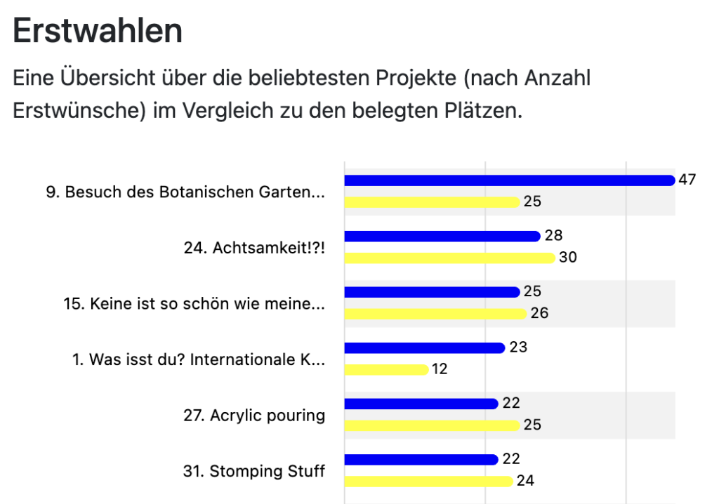 Unter Erstwahlen sehen Sie welche Projekte beliebt sind. Im Beispiel haben 47 Schüler den Besuch des botanischen Garten gewählt. Das Projekt hat aber nur eine Größe von 25. Daher ist dieses Projekt ein Kandidat die Projektgröße zu erhöhen.