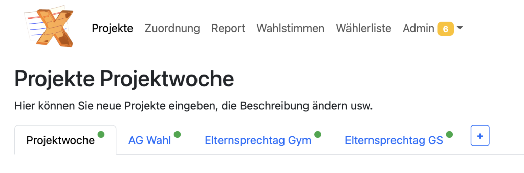 - Projekte: Hier können Sie die Projekte eine Wahl administrieren, neue Projekte anlegen, löschen oder ändern.